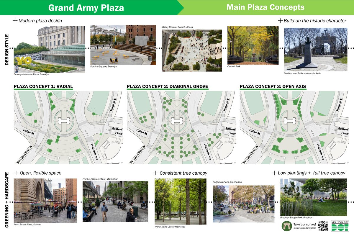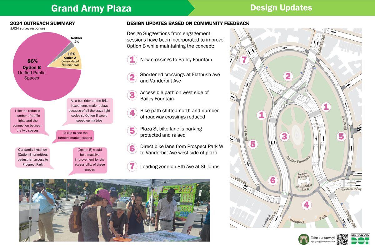 NYC DOT released their latest design boards for the Grand Army Plaza redesign at this week’s public workshops. The boards show the updated plan based on community feedback, three plaza design concepts, and the full traffic and operations analysis.