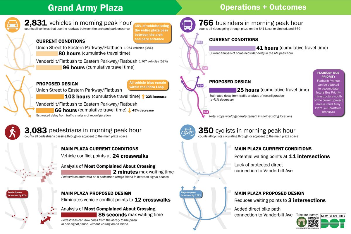 The numbers. Crosswalks drop from 24 to 12. Intersections from 11 to 3. B41 rider delay decreases 41%. Vanderbilt/Flatbush travel time to Eastern Parkway decreases 45%. Pedestrians can cross from the library to the plaza in a single signal phase.