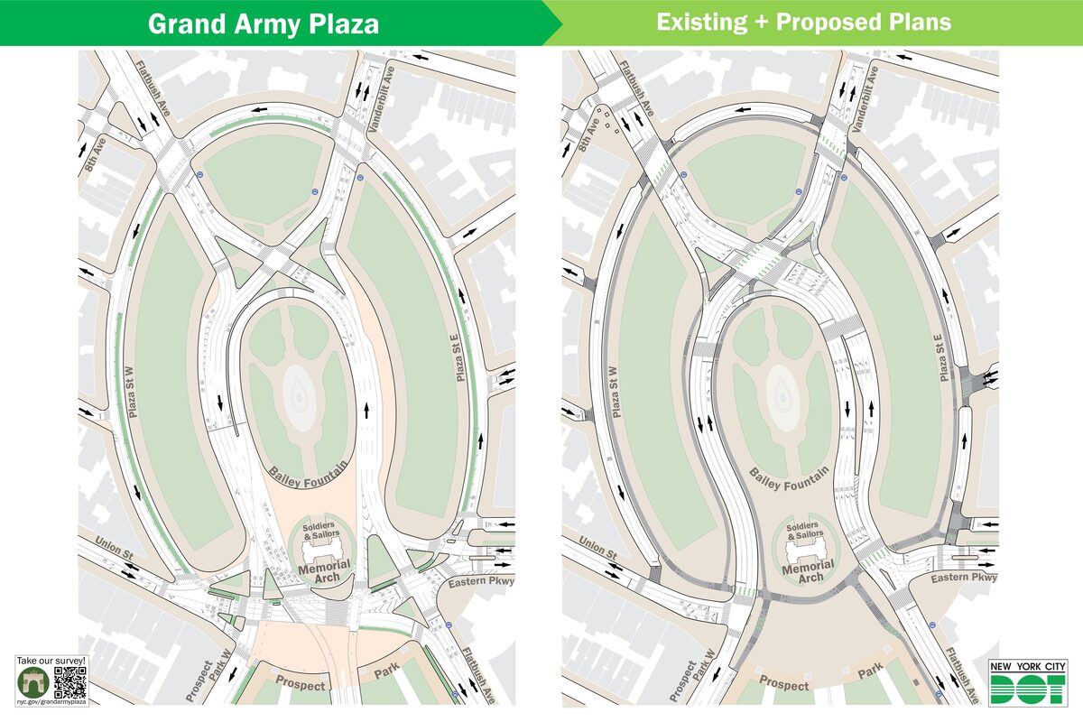 Side-by-side comparison of the current layout and the proposed design. The southern roadway between the Arch and Prospect Park is replaced with pedestrian space.